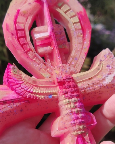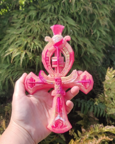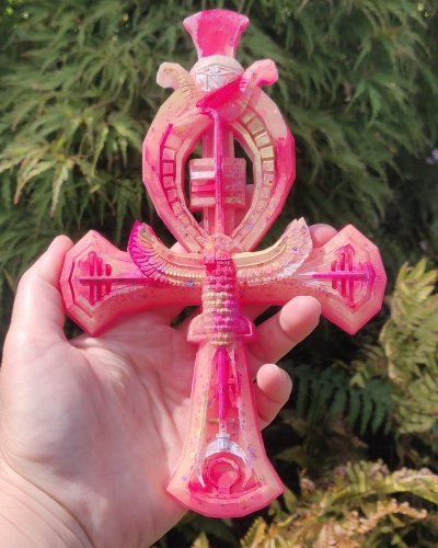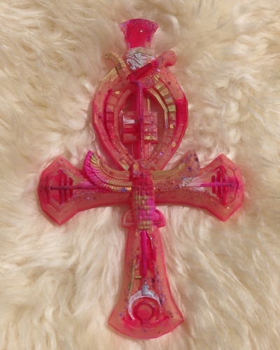 Deze prachtige Ankh heeft roze en zalmroze tinten met wit en goud. Ze staat symbool voor onvoorwaardelijke zelfliefde. Krachtig, uitgesproken en duidelijk.