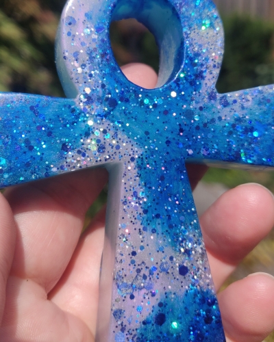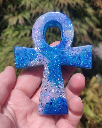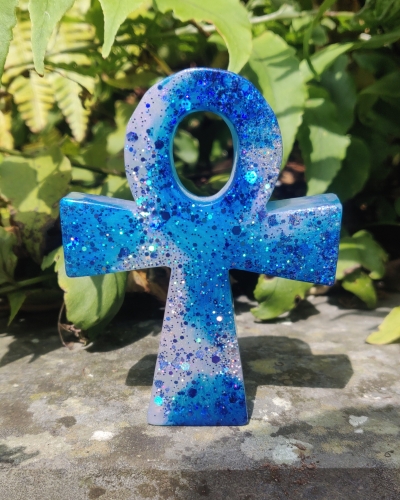 Deze prachtige Ankh is blauw met zilver. Verkoelend en vloeibaar.