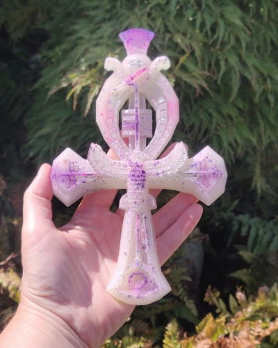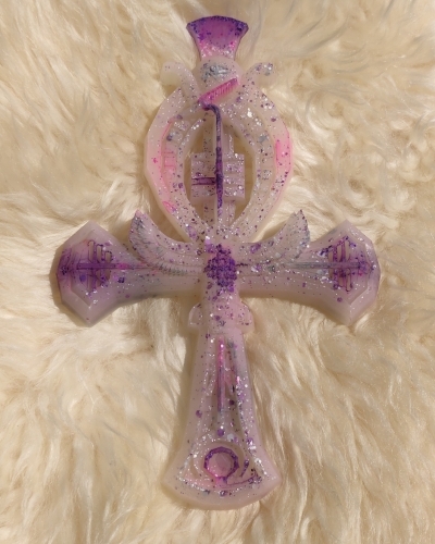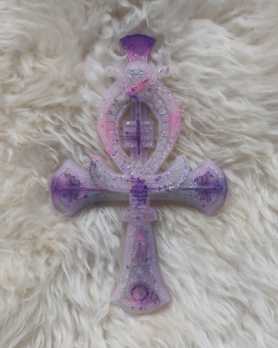 Deze prachtige Ankh is wit met roze en paarse accenten en zilveren spikkels. Ze voelt heel puur en etherisch. De paarse accenten leggen de verbinding met het derde oog chakra.