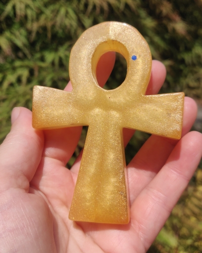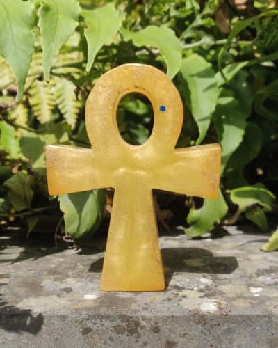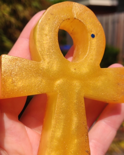 Deze prachtige Ankh is geel met een beetje goud en één ondeugende blauwe glitter. Ondeugend, zonnig en speels.