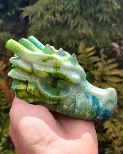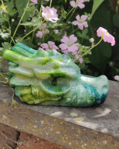 Deze prachtige draak is groen in verschillende tinten met een klein beetje groen-blauw (teal). Ze staat symbool voor onze prachtige Moeder Aarde met al haar tinten groen en blauw. De bossen, de weilanden, de zeeën en de meren.