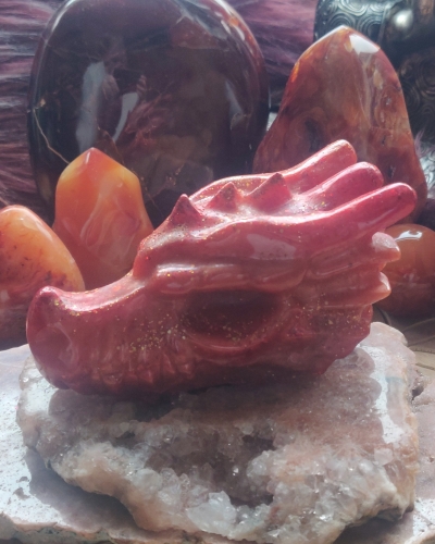 Deze prachtige draak is rood. Heel uitgesproken. Het rode staat voor de verbinding met je wortel chakra. Je bestaansrecht.