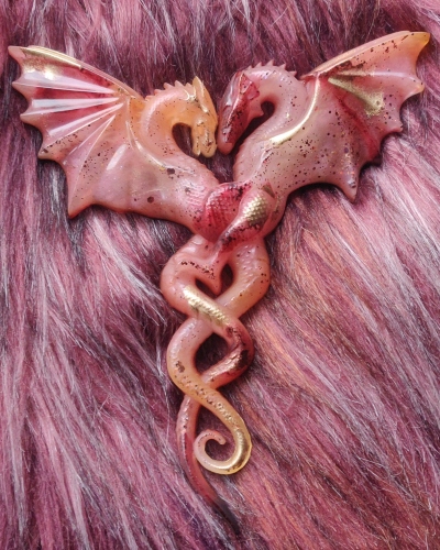Dit prachtige drakenkoppel is oranje-roze, rood en goud. De kleuren staan symbool voor het goud dat te vinden is in een gebalanceerd sacrale chakra.