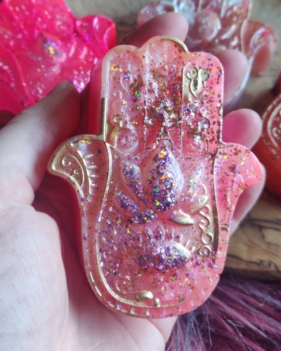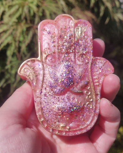 Deze prachtige Hamsa is zachtroze met paars en goud. Ze straalt zelfverzekerde vrouwelijke energie uit.