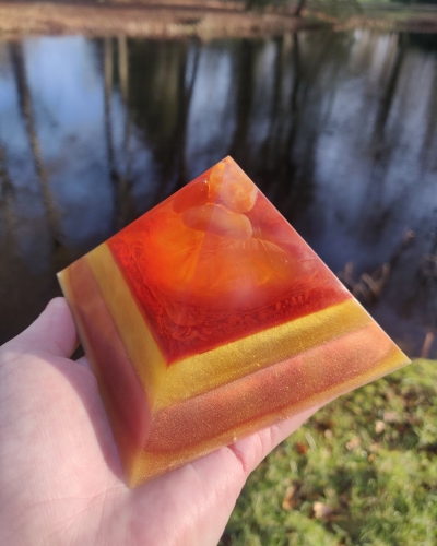 Het kleurenspel in deze piramide heeft wel wat weg van een gouden zonsondergang. De zachte schakeringen van rood, oranje, goud en geel, geven een warme gloed rond je sacrale chakra.