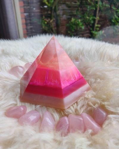 Helemaal in het verlengde van de liefdevolle rozenkwarts energie, bevat deze piramide roze kleuren. Het zachte roze staat voor rust en een liefdevolle bedding. De fel roze kleur voor de joy, het plezier en de reminder dat het allemaal heel licht en speels mag zijn. En tot slot het donker roze om alles te versterken.