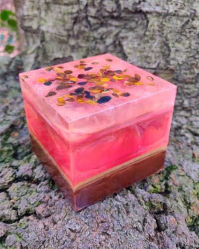 The tiger’s eye seeds of this beautiful watermelon cube are all about self-confidence and inner strength. And the red and brown in the cube are earthy colors and associated with the root chakra and Mother Earth.