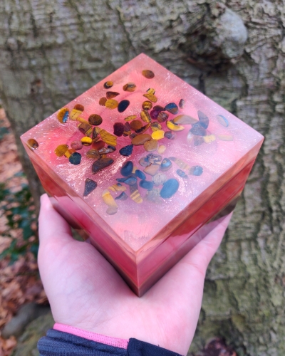 Materiaal | Een combinatie van giethars, kleurpigment en edelstenen |