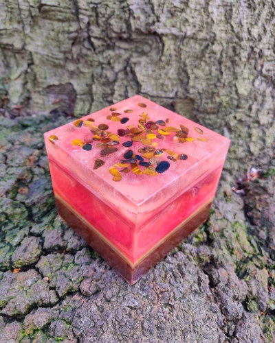 Deze kubus lijkt echt op een watermeloen. Ze is rood, goud en bruin. Rood voor je wortel chakra, bruin voor de aarde en goud voor je zelfvertrouwen en overvloed!