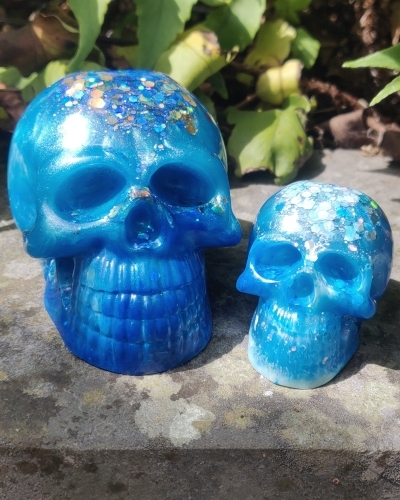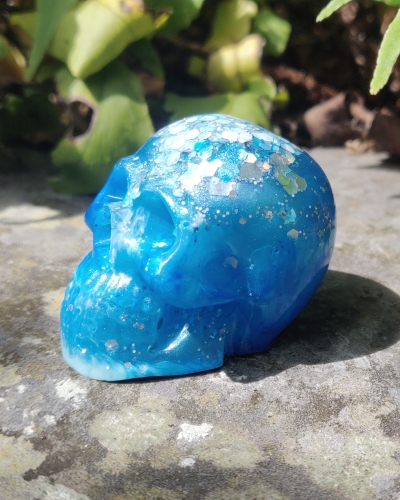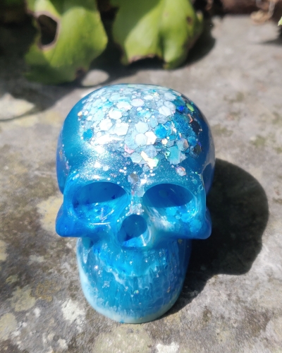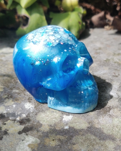 Deze prachtige schedel is blauw in verschillende tinten, met een beetje zilver. Deze kleuren staan symbool voor je keel chakra en de magie van jezelf uitspreken.