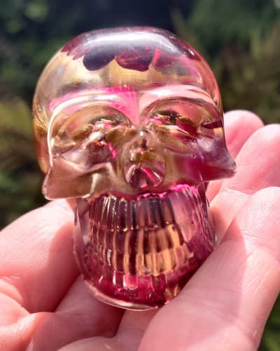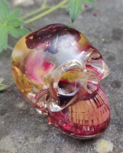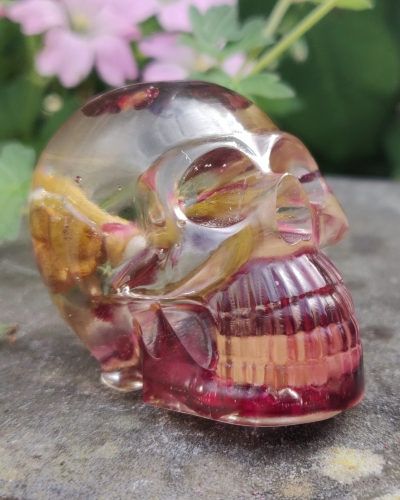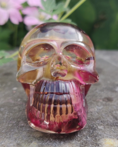 Deze prachtige kleine schedel bevat granaat, rozenknopjes en rozenblaadjes. Ze voelt zacht, warm en sensueel.