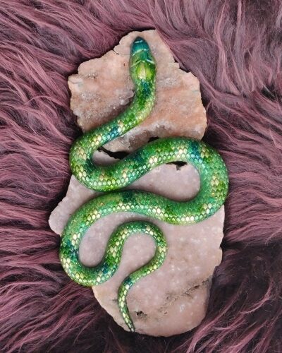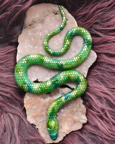 Deze prachtige slang is verschillende tinten groen met goud. De groene kleur staat symbool voor het hart chakra.