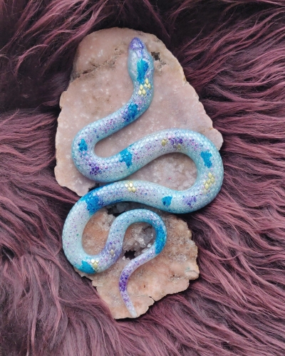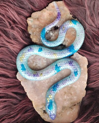 Deze prachtige slang is verschillende tinten blauw met goud. De blauwe kleur staat symbool voor het keel chakra.