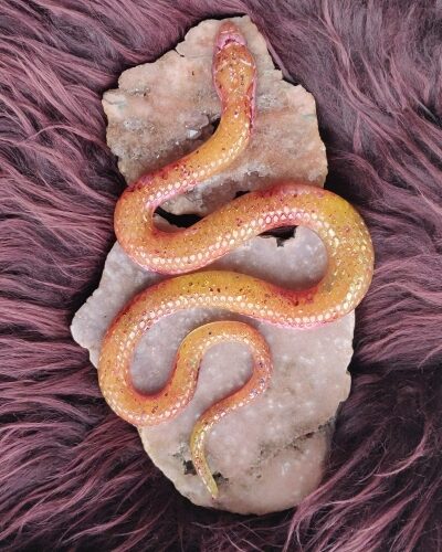 Deze prachtige slang is geel met een beetje wit, rood en goud. De gele kleur staat symbool voor het zonnevlecht chakra.