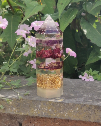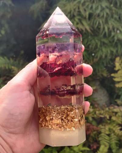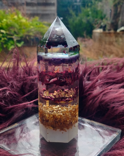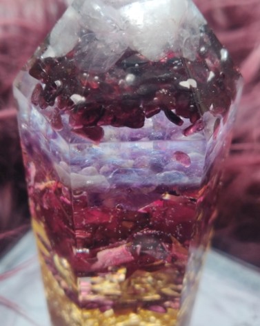 Deze prachtige toren werkt op je zonnevlecht chakra (granaat en goudsnippers) en zorgt zo voor meer kracht en zelfvertrouwen. De rozenblaadjes en morganiet zorgen voor het openen van je hart chakra waardoor je makkelijker liefde kan geven EN ontvangen. Ze werkt ook op het derde oog door de amethist en paarse kleuren, waardoor je in balans komt en je intuïtie versterkt wordt. Deze drie chakra’s worden in balans gebracht en uitgelijnd, waardoor je met een rechte rug, in liefde, en in balans, volledig in contact staat met je intuïtie.