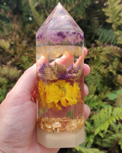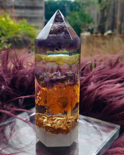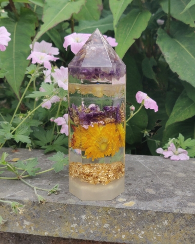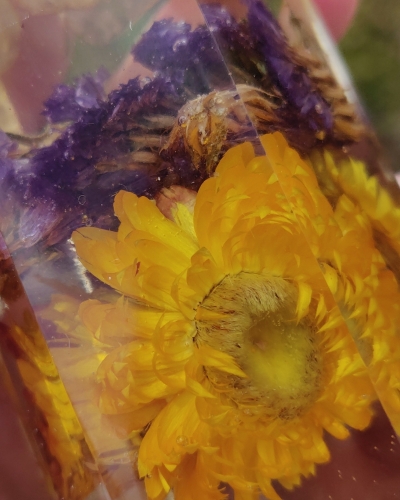 Materiaal | Een combinatie van giethars, kleurpigment, edelstenen, bloemen en goudsnippers |