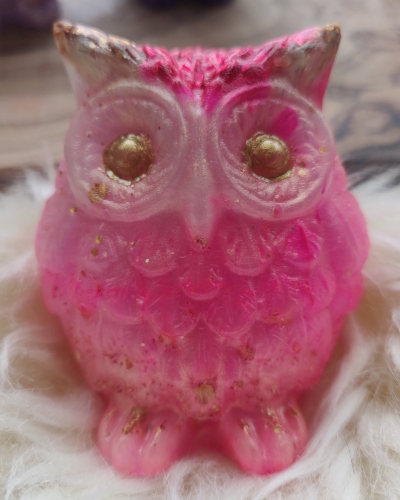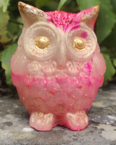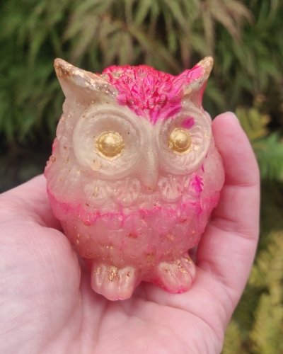Dit prachtige uiltje is roze met gouden ogen. De kleuren staan symbool voor je hart.