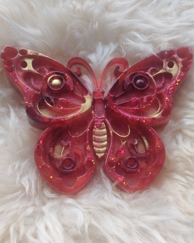 Deze prachtige vlinder is verschillende tinten rood met goud. Ze staat symbool voor de warme bedding en creatiekracht van je baarmoeder (energie).