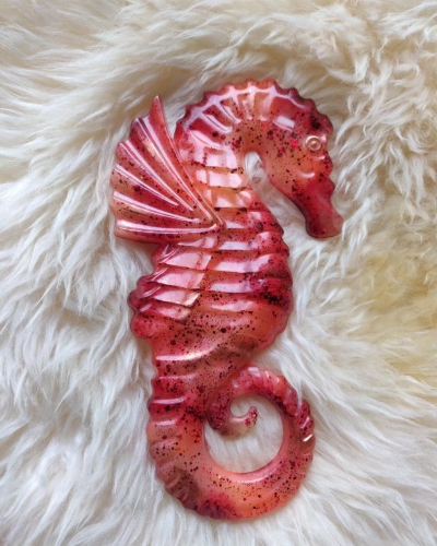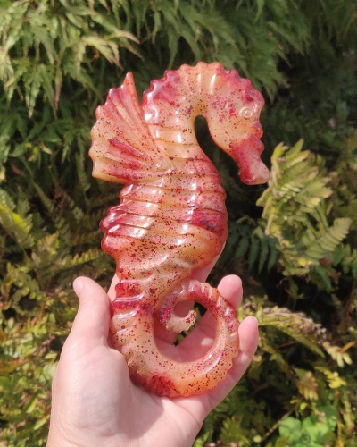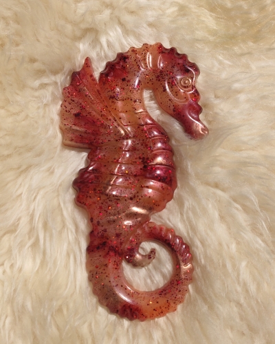 Dit prachtige zeepaardje is verschillende tinten rood en oranje-roze. Zachte, warme kleuren. Symbool voor het wortel chakra en het sacrale chakra.