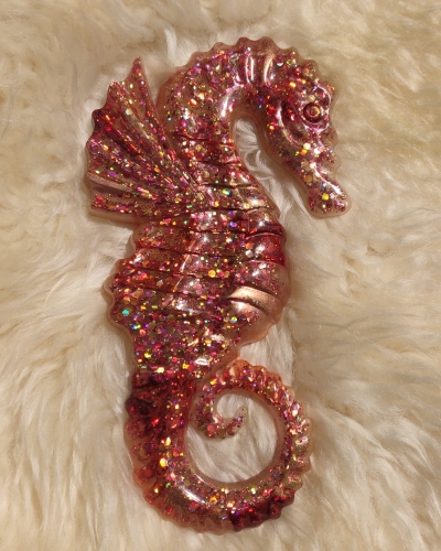 Dit prachtige zeepaardje is oranje-roze met een diepe warme rode kleur en gouden glitters. Deze kleuren staan symbool voor het sacrale chakra en het wortel chakra/veiligheid.